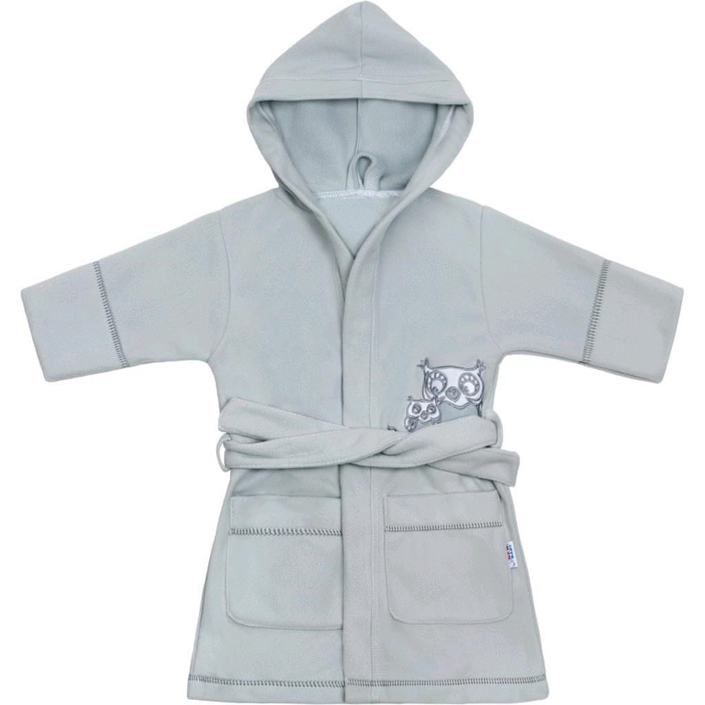 Otroški kopalni plašč New Baby Owls. Kopalni plašč krasi slika sovic, kapuca in dva žepa. Kapuca ščiti mokro glavico pred mrazom, mehak in topel material pa je idealen za občutljivo otroško kožo. Otroška halja se zavezuje z vrvicami. Dimenzije: dolžina od naramnic približno 68 cm, obseg okoli prsnega koša približno 82 cm, dolžina rokava približno 35 cm. Sestava: 100 % poliester.