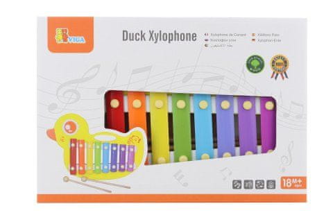 Leseni ksilofon v obliki račke. Dimenzije približno 32,5 × 21,5 × 3,2 cm. Dimenzije paketa približno 33 × 22,5 × 4 cm. Starost 18m+