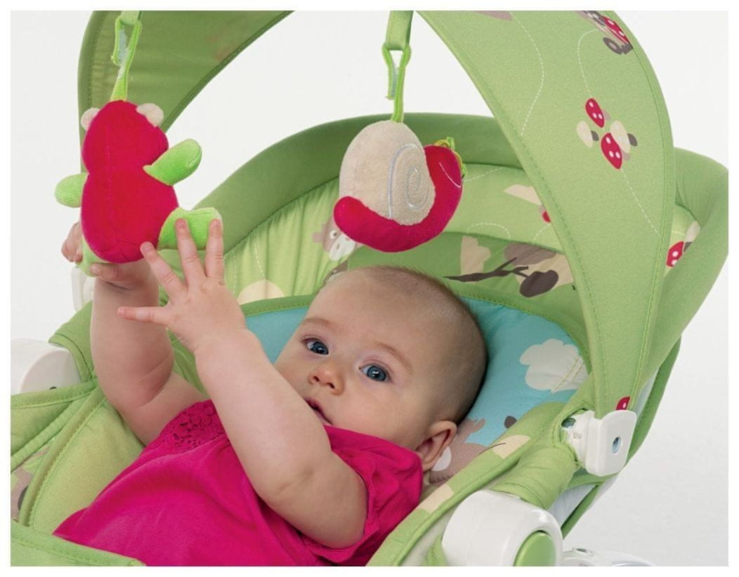 Ležalnik Foppapedretti Lunapark je opremljen z glasbeno napravo in strehico kjer visijo igrala. Naklon ležalnika je nastavljiv. Kompakten ko je zložen. Na ležalniku je že mehak vložek double face
