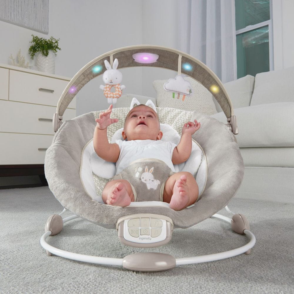 V ležalniku Ingenuity Twinkle Tails se bo otrok počutil, kot da je v varnem objemu, mama pa se bo lahko sprostila. Ta ležalnik pomaga ohranjati otroka mirnega in varnega ter zagotavlja maksimalen počitek ali zabavo. Udoben sedež vključuje odstranljiv vložek za novorojenčke v obliki zajčka, ki se lahko uporablja kot samostojna igralna podloga ali previjalna podloga. Dojenčka bodo očarale mehke lučke, ki plešejo na nadstrešku ležalnika, ki vključuje tudi 2 prikupni igrači. Prijetne melodije, zvoki narave, beli šum in nežne vibracije bodo pomirili vsakega dojenčka.