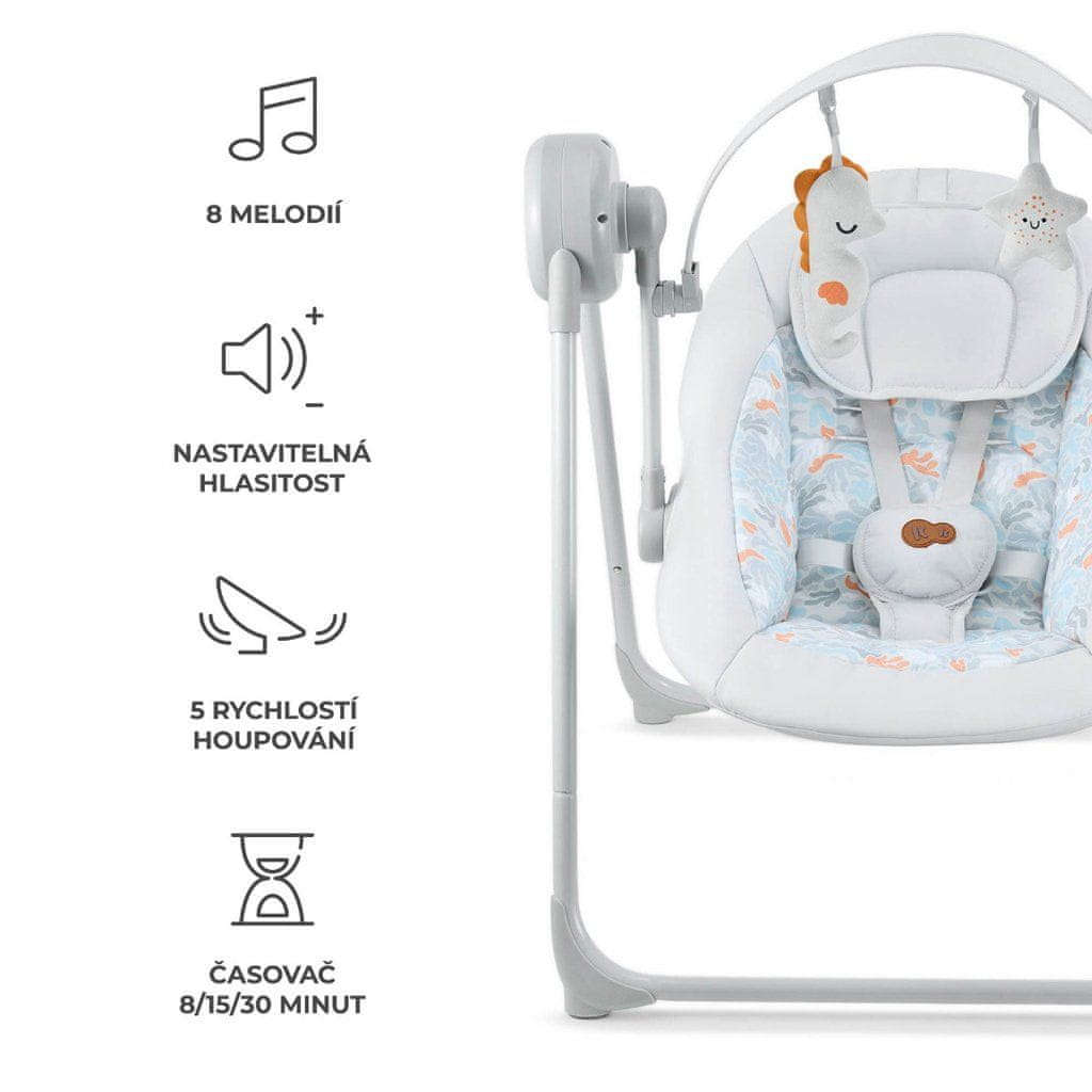 Gugalnica z več funkcijami, ki se prilagaja otrokovim potrebam. SWINGEE ponuja udobje, varnost in praktičnost v eni lahki in zložljivi rešitvi. Uporabljate ga lahko doma ali na poti, ponuja pa več možnosti napajanja – iz električnega omrežja, powerbank ali na baterije. S petimi stopnjami nastavitev zibanja in časovnikom lahko enostavno prilagodite gibanje otrokovemu razpoloženju in potrebam. Na voljo je tudi 8 pomirjujočih melodij, vključno z zvoki narave, ki pomagajo otroku, da se bolje sprosti. Lahka zasnova tehta le 3,7 kg, zaradi sistema zlaganja pa je SWINGEE praktičen za shranjevanje in prenašanje. Za največje udobje je sedež nastavljiv v dveh položajih – za ležanje in polležeč položaj. Varnost zagotavljajo 5-točkovni varnostni pasovi z mehkimi prevlekami in ergonomska nastavljiva blazina. Dve mehki igrači na trapezu podpirata motorični razvoj in spodbujata otrokova čutila.