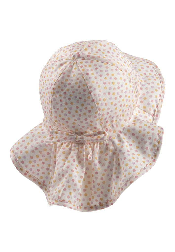 Lahka bombažna tkanina ima fino laneno teksturo. Drobne pike so v dekliški modi vedno modne in se seveda odlično kombinirajo s pisanimi in vzorčastimi otroškimi oblačili. Rahlo valovit rob klobuka ščiti oči pred bleščanjem sonca. Klobuk je opremljen z vrvicami za zavezovanje pod vratom, kar bo cenila vsaka mala princeska, ki ne želi, da ji klobuk pade z glave. Rahlo narebren rob ima tudi izdatno zaščito vratu na zadnjem delu in enakomerno pokriva ušesa in vrat, hkrati pa ščiti oči pred premočno sončno svetlobo.