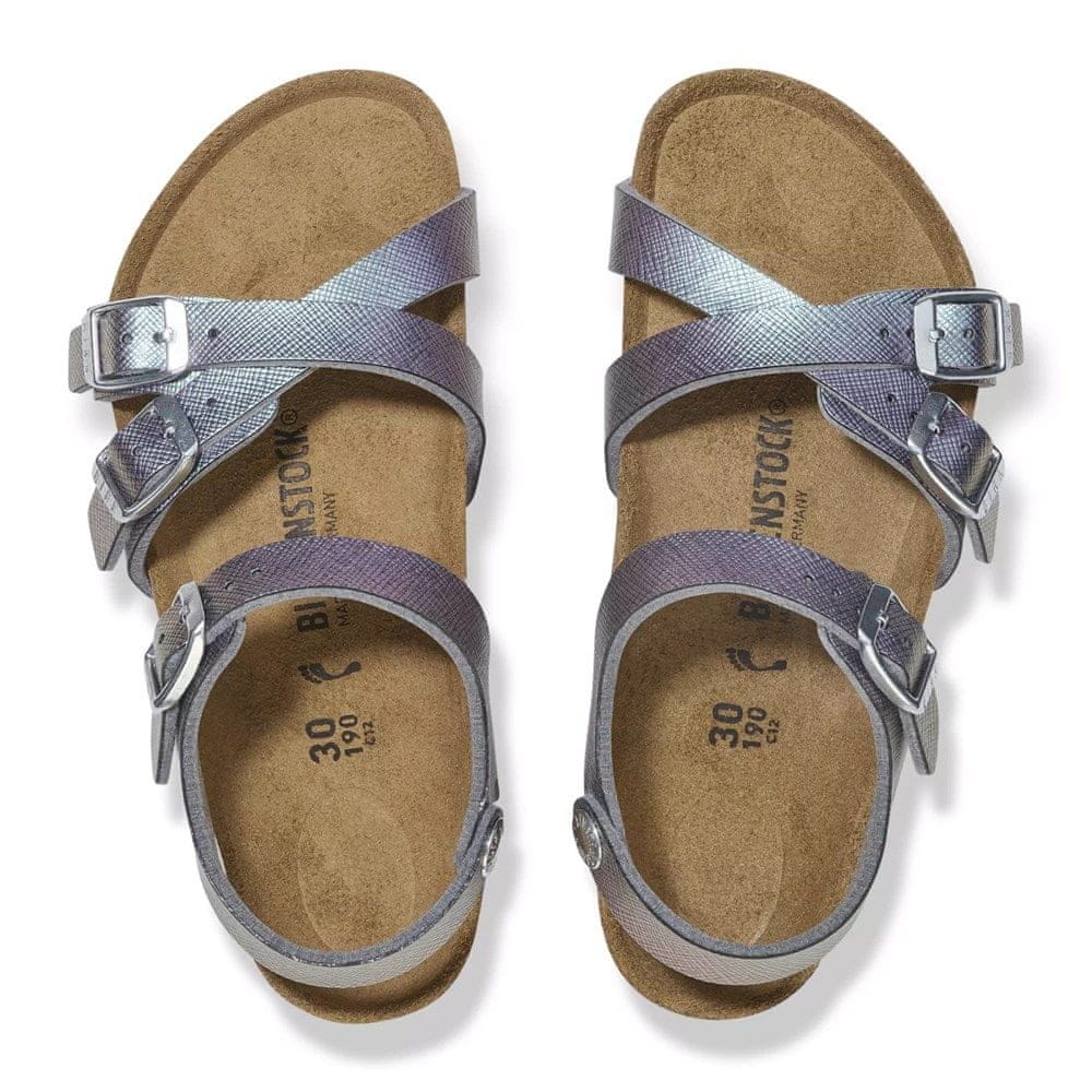 Igrivi sandali BIRKENSTOCK Kumba imajo prekrižane trakove in trak za peto za udobje in stabilnost. So popolna izbira za tople poletne dni. Kar se tiče oblikovanja, se čevelj predstavlja na povsem nov način, tokrat preseneča z mavričnim leskom svile. Šrafirana tekstura saffiano usnja spominja na usnjene dodatke znanih modnih hiš. Zgornji del je izdelan iz koži prijaznega, trpežnega sintetičnega materiala Birko-Flor®, ki je reliefno oblikovan.