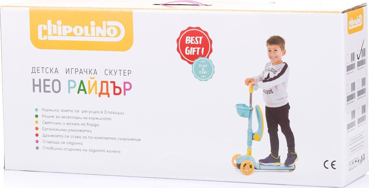 Otrok lahko vozi skuter samostojno ali kot skuter Lahki okvir tehta le 3,68 kg aluminijasta T-ročnica po višini nastavljivo krmilo sedež je mogoče zložiti. gumijasti nedrseči ročaji Izjemno široka prednja kolesa z barvnimi lučmi LED Premer kolesa: spredaj 120 mm, zadaj 80 mm nožna zavora na zadnjem kolesu širok protizdrsni podstavek za noge z lučkami LED in melodijami košara za shranjevanje spredaj