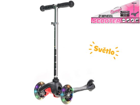 Stopar s tremi kolesi je idealen za seznanjanje otrok s skuterji. Med vožnjo otroci izboljšujejo motorične sposobnosti, koordinacijo, se ukvarjajo s športom in se zabavajo. Črni skuter ima nastavljivo krmilo z osvetljenimi kolesi s svetlečimi diodami LED. Primeren je za otroke od 24. meseca dalje.