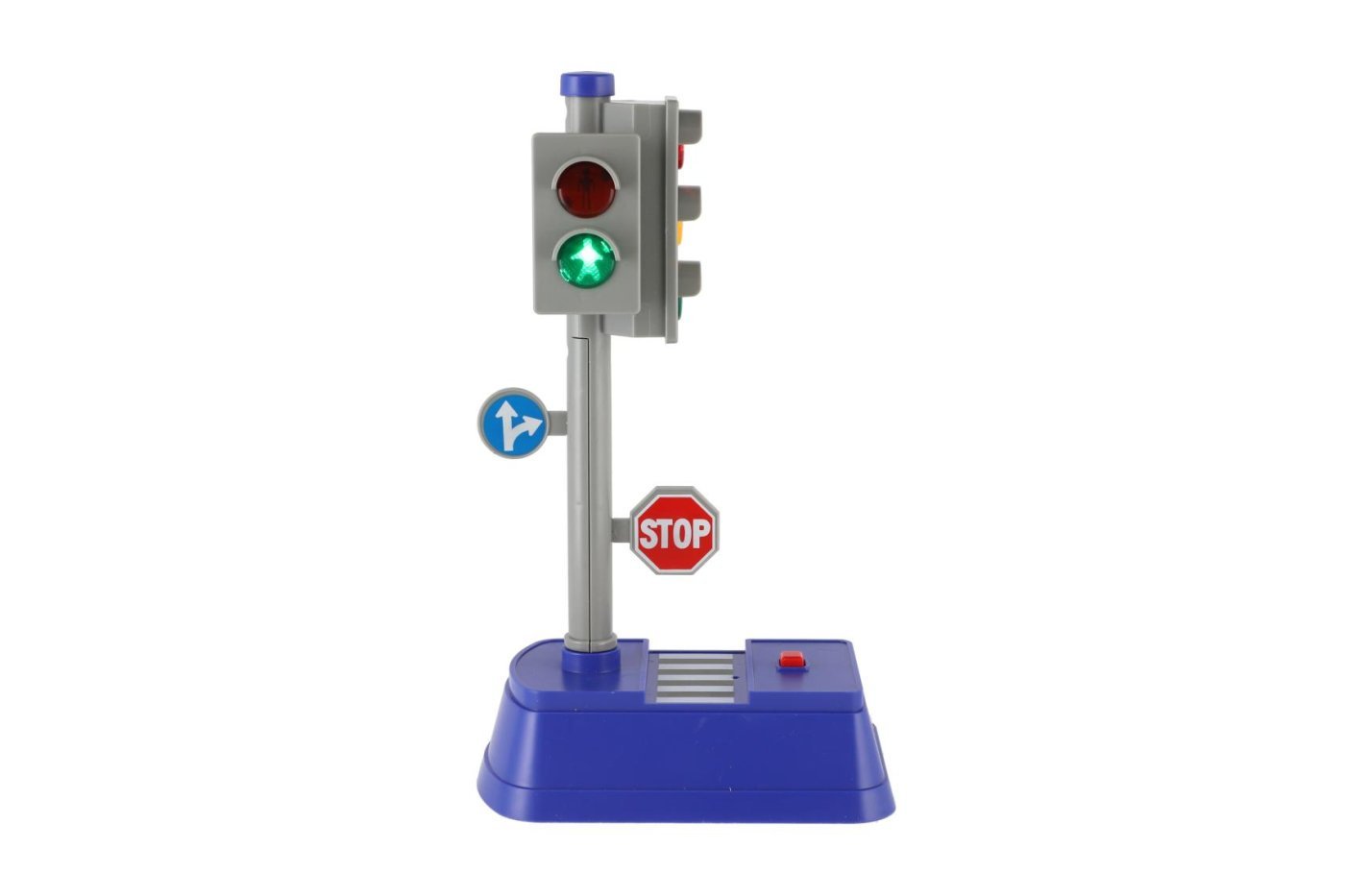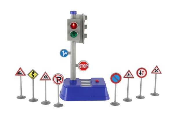 Set semaforjev z oznakami. Semafor ima svetlobne učinke, lahko se uporablja kot izobraževalno orodje pri učenju osnov cestnega prometa. Vključene so 2× baterije AA. Dimenzije paketa 14 × 25 × 9 cm. Primerno za otroke od 3. leta starosti dalje.