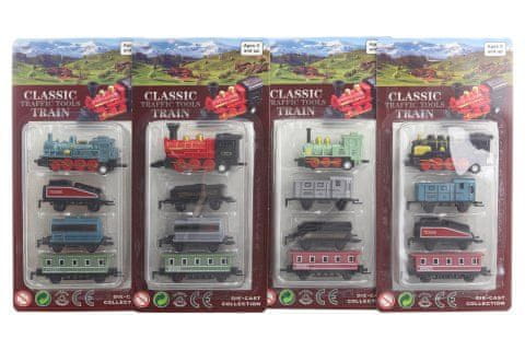 Komplet kovinskih motorjev vključuje lokomotivo in 3 vagone. Dimenzije lokomotive približno 7 × 3,5 cm. Velikost paketa je približno 11 × 22 × 3 cm. Starost 3+