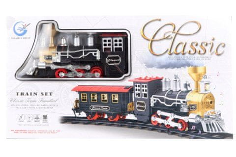 Plastična vlakovna proga z lokomotivo na baterijski pogon. Lokomotiva se prižge, proizvaja zvoke in kadi. Napajanje s 4 baterijami AA (niso vključene). Paket vključuje 6 tirov, lokomotivo in avtomobilček. Dimenzije paketa približno 41,5 × 22,5 × 7 cm. Starost 3+