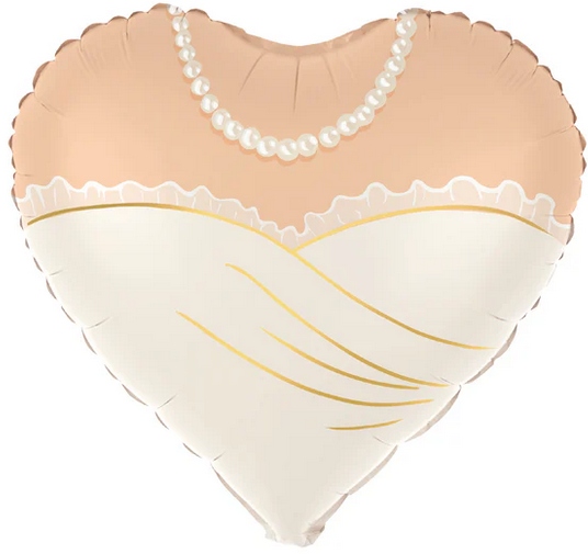 Folija balon v obliki srca, okrašen s poročno obleko in biserno ogrlico.
