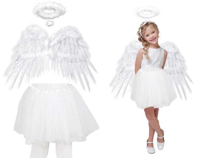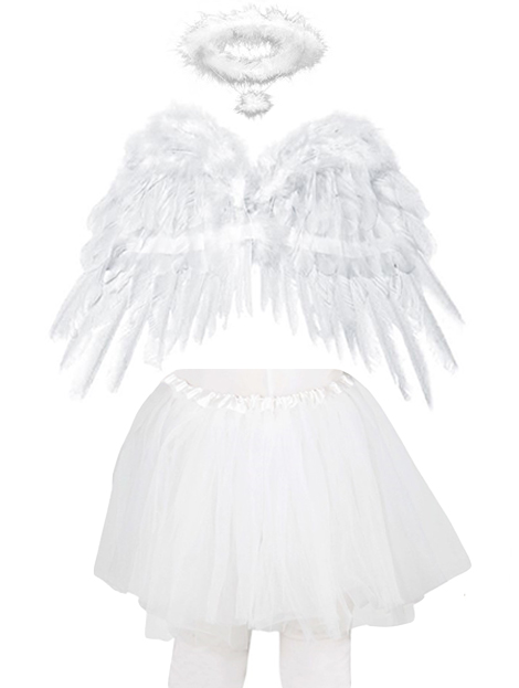 Bela angelska krila, prekrita s perjem. Priložena sta tudi bel puhast areo in belo tilasto krilo tutu. Popoln komplet za božične predstave ali šolske igre. Krila imajo naramnice za lažje nošenje, areo ima naglavni trak, krilo pa ima elastičen pas.