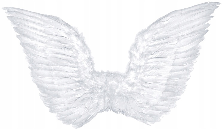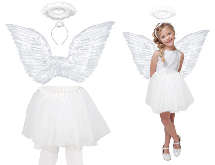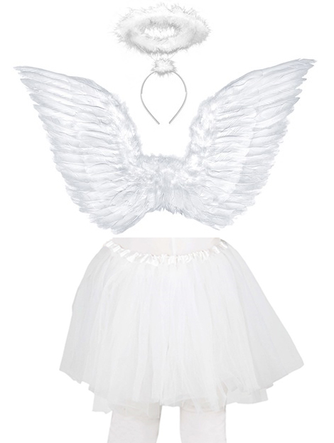 Bela angelska krila, prekrita s perjem. Priložena sta tudi bel puhast areo in belo tilasto krilo tutu. Popoln komplet za božične predstave ali šolske igre. Krila imajo naramnice za lažje nošenje, areo ima naglavni trak, krilo pa ima elastičen pas.