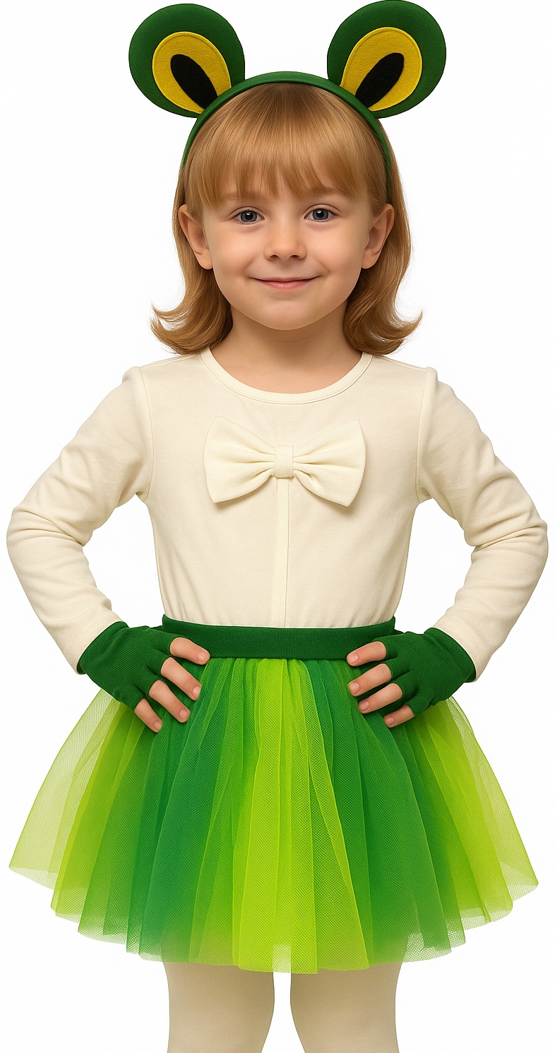 Trak za naglavnik z značilnimi žabjimi ušesi, zelena baletna krilo in zelene rokavice bodo vašega otroka v trenutku spremenili v pravo žabo.