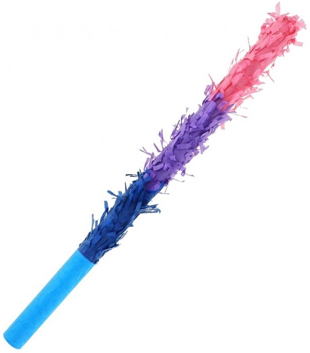 Lahka palica za razbijanje pinjat, okrašena z nežnim, barvitim svilenim papirjem v odtenkih modre, vijolične in roza barve.