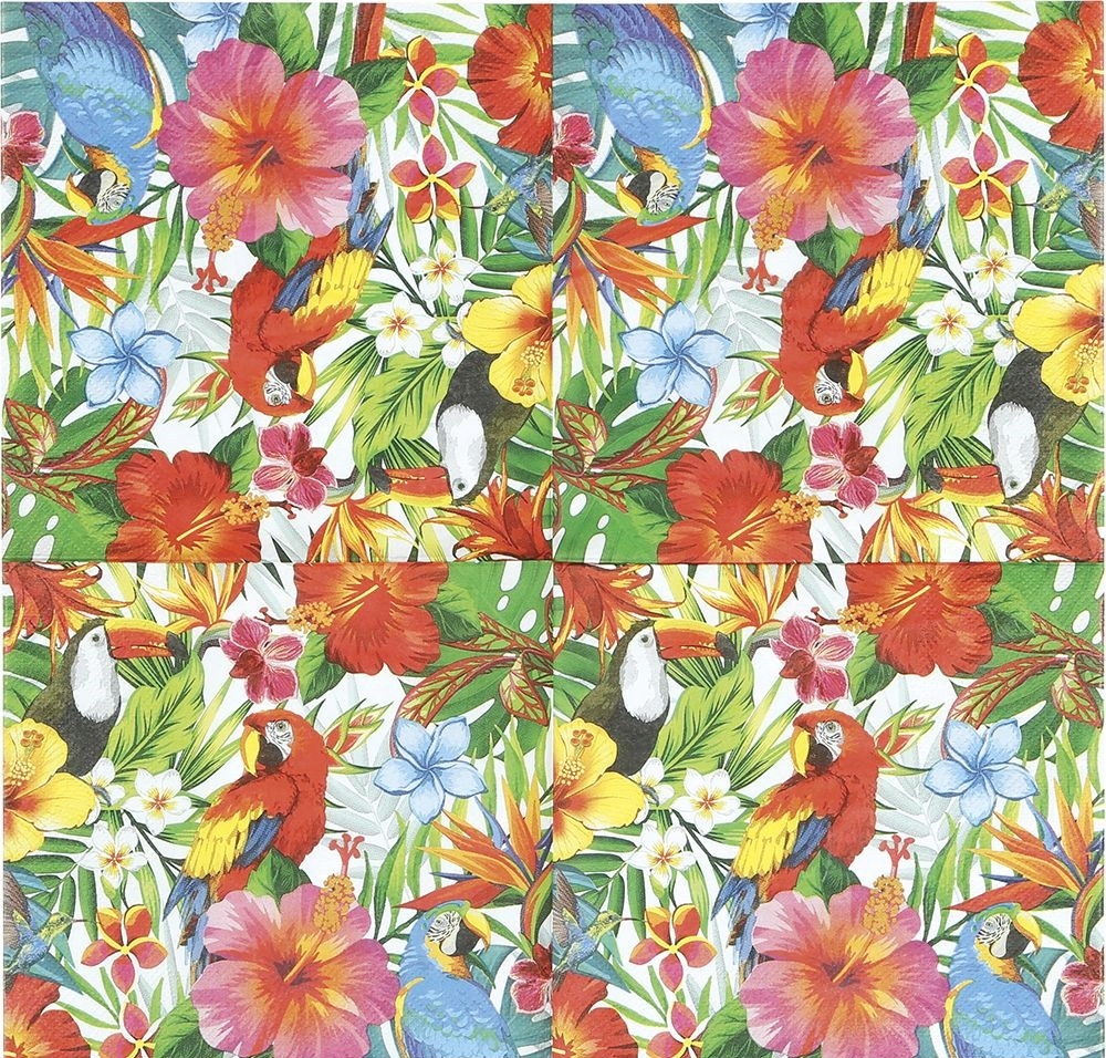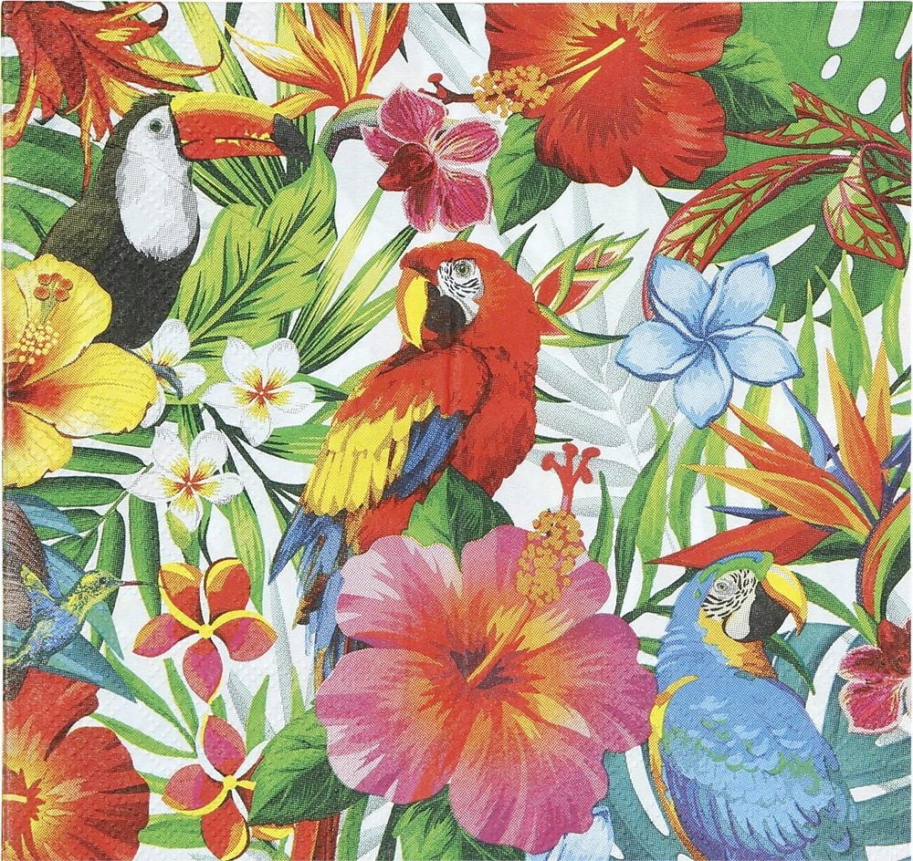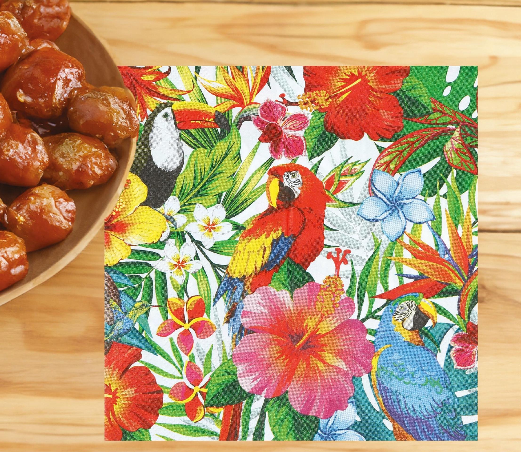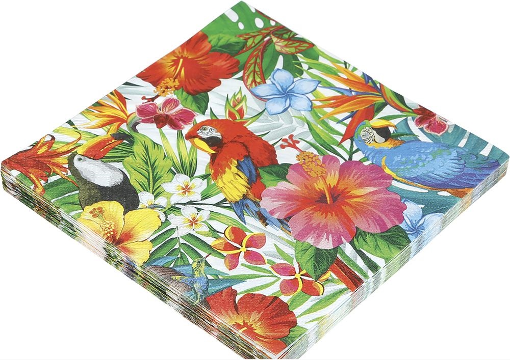 Tropski papirnati servietki z motivom barvitega cvetja in papige.