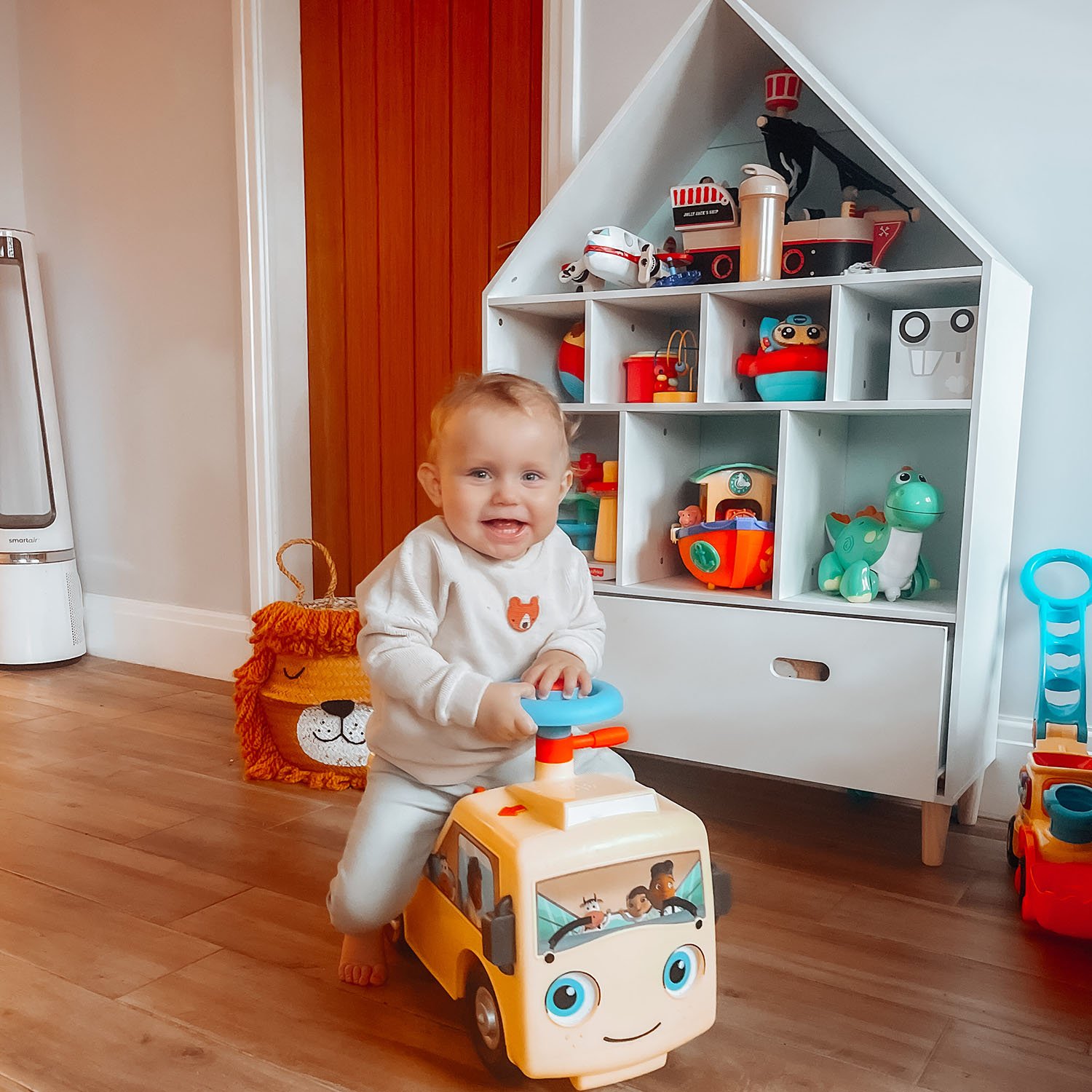 pisana knjižna omara, v katero lahko shranite vse igrače, knjige in dodatke. Ta knjižna polica je s svojimi nežnimi barvami, obliko hišice in policami v obliki kocke prava izbira za opremljanje otroške sobe ter ustvarjanje prijetnega in udobnega vzdušja.Vsebine: