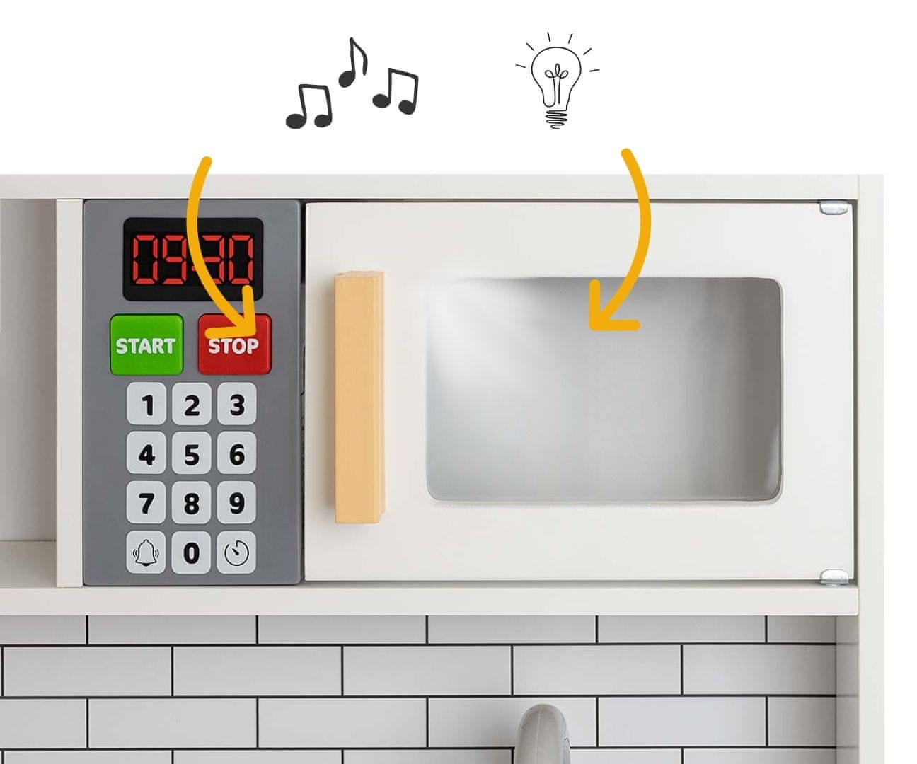 Delovna površina ima realistično izgledajočo električno kuhalno ploščo z dvema kuhalnima ploščama in gumbom, ki aktivira zvoke, ter enojno siv umivalnik z premičnim pipom in pipami. Nad kuhalno ploščo je nameščena imitacija nape v niši nad pečico – nalepka. Nad pomivalnim koritom, na zgornji polici, je osvetljena mikrovalovna pečica z odpirajočimi vrati in prozornim plexiglasnim oknom, da mali kuhar lahko vidi hrano v notranjosti. Za upravljanje mikrovalovne pečice sta na voljo dva gumba: START, ki aktivira zvoke in svetlobo segrevanja hrane, in STOP, ki te funkcije izklopi.