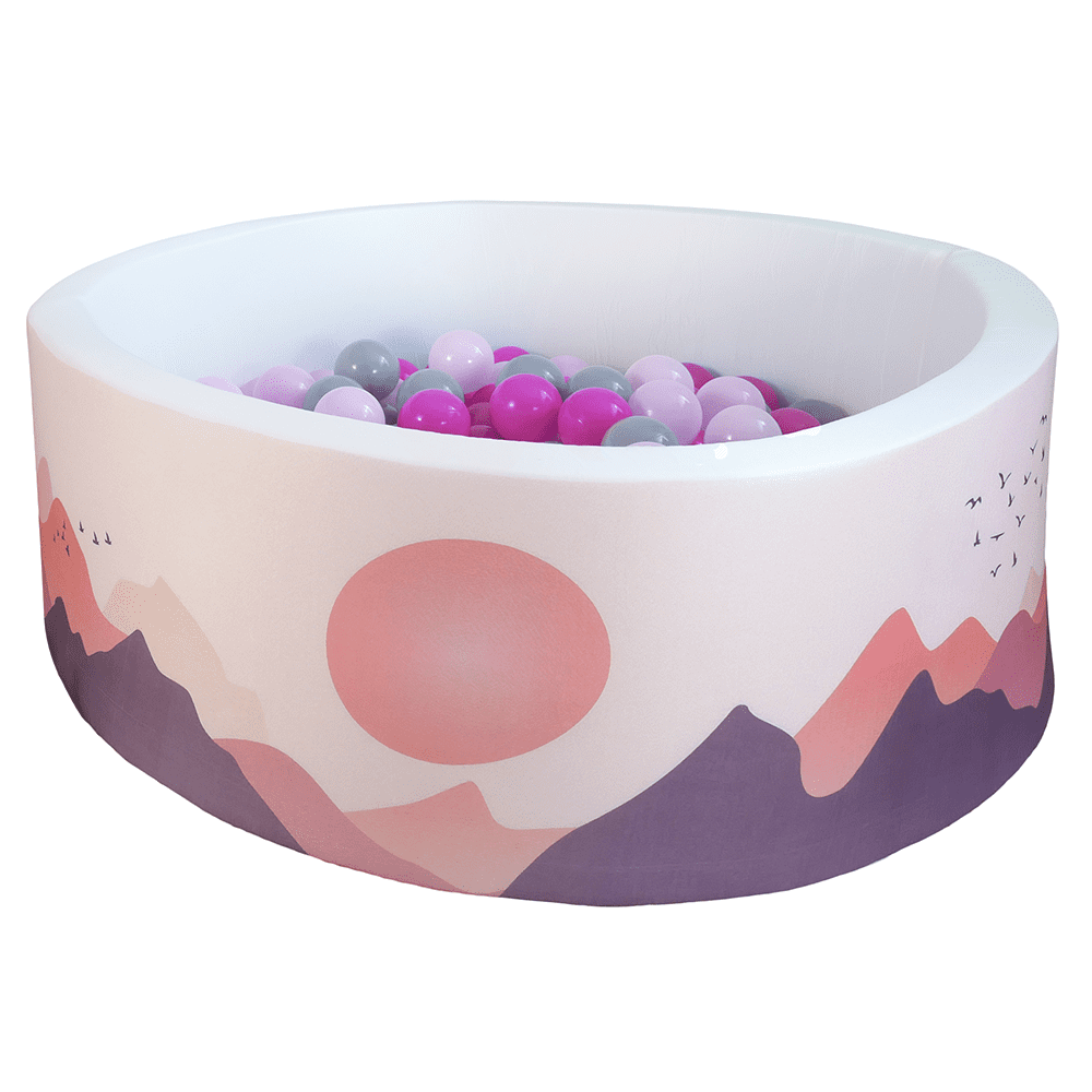 Imate doma majhno princesko, katere soba je popolnoma usklajena v odtenkih rožnate barve? Naš suhi bazen z motivom gora in jati ptic v rožnatih in vijoličnih odtenkih je popoln dodatek in zabava prav za take princeskine sobe. Eleganten, stilski in preprost dizajn z modernim pridihom. Bazen je primeren za otroke od 1. leta starosti.