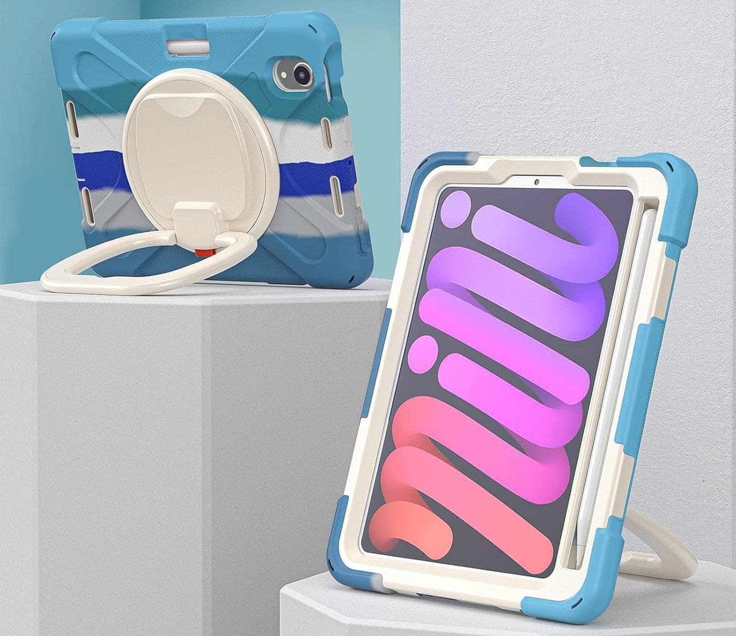 Etui za iPad Mini 6 8.3" z vrtljivim stojalom in prostorom za pisalo, modro. Troslojna zaščita (PC/silikon) ščiti pred udarci in praskami. 360° vrtljivo stojalo in ergonomski ročaj omogočata udobno uporabo. Popolni izrezi in prostor za pisalo. Celoten opis