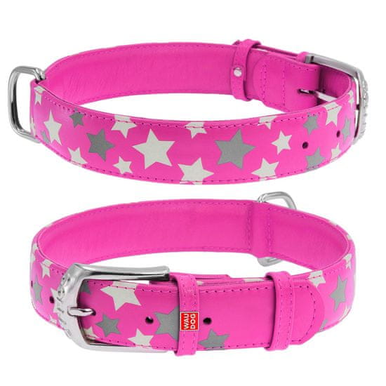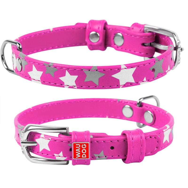WAUDOG usnjena odsevna in svetleča fosforescentno roza ovratnica z zvezdicami 19-25 cm, širina: 9 mm roza