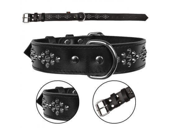 Izjemna pasja ovratnica v intenzivni črni barvi, izdelana iz trpežnega naravnega usnja, okrašena z neti.