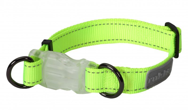Trpežna in vsestranska ovratnica z visoko vidljivostjo. Lahko prenese temperature od –20°C do +40°C. Vidljivost do 300 m. Odporen na škropljenje vode. Najlonski trak svetle neonske barve in odsevni detajli. Zaponka z LED lučko. Dva različna načina utripanja in en način neprekinjene svetlobe.