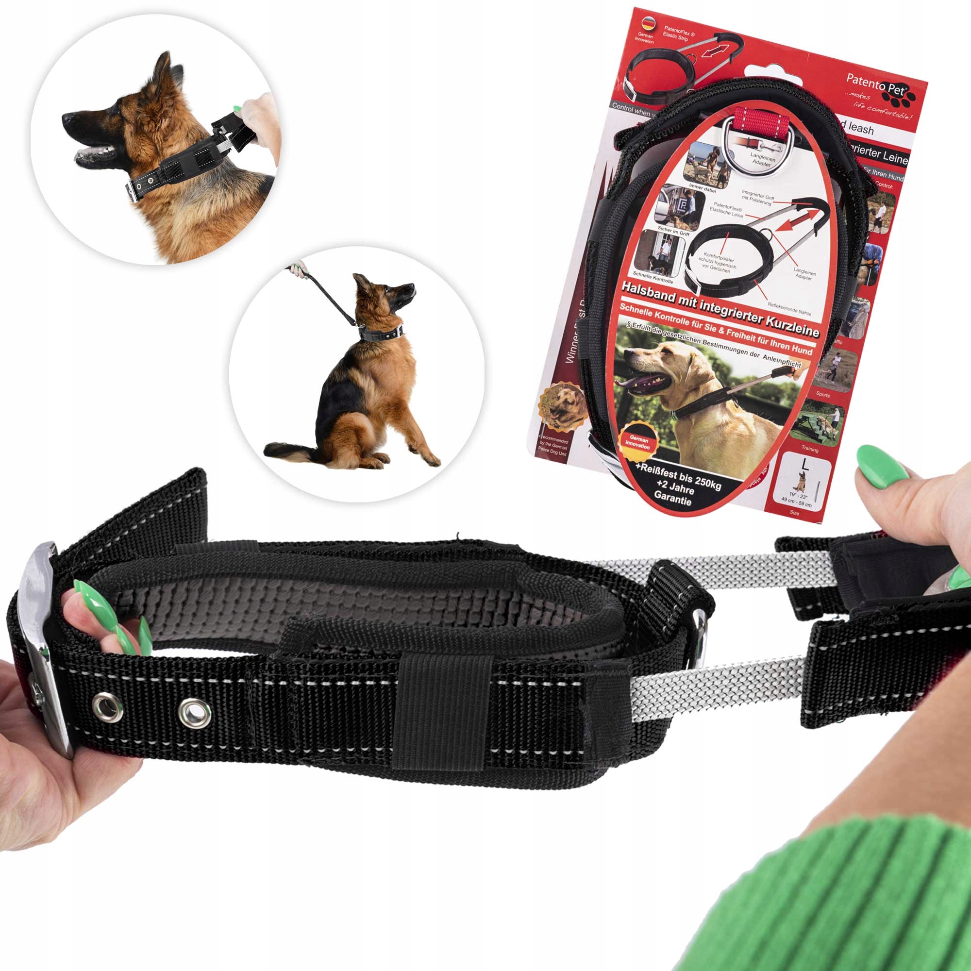 • ✅Poleg standardne funkcije je ovratnica opremljena s posebnim ročajem. Uporaba inovativnega materiala Patento Flex pomeni, da se ročaj – integriran povodec zloži v ovratnico, ko ga ne potrebujete.