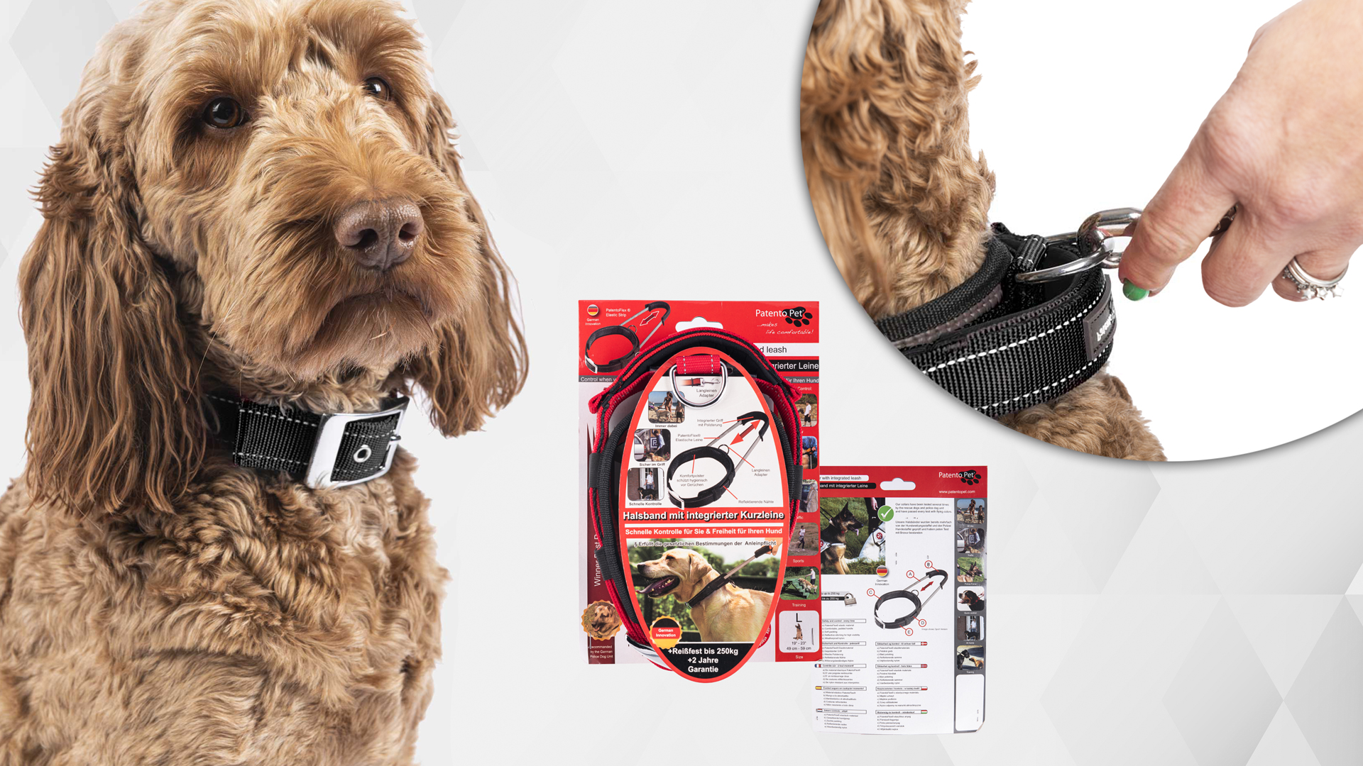 • Popolno udobje za vas in vašega ljubljenčka – ovratnica, integrirana s kratkim, zložljivim povodcem z oblazinjenim ročajem