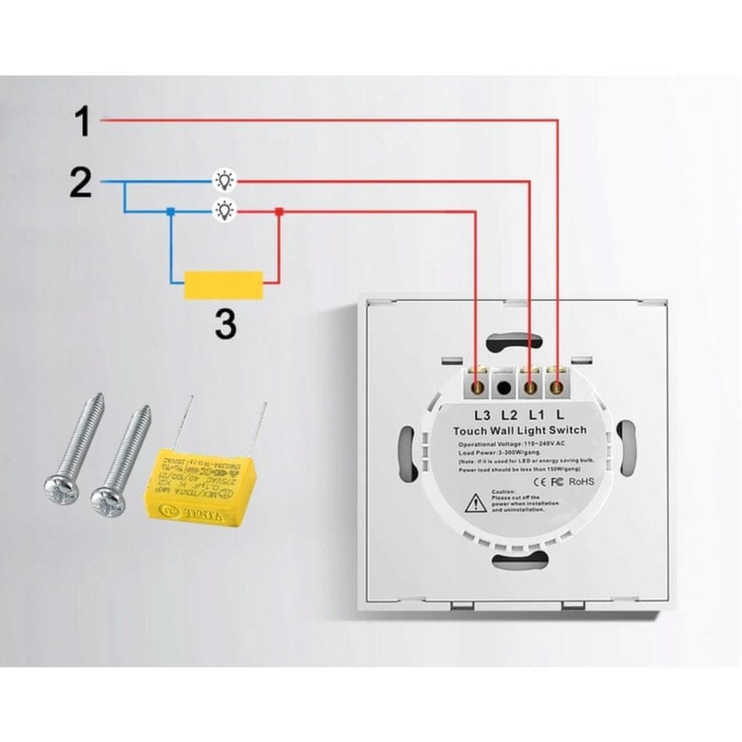 3 – Priklop „L3“ fazni kabel žarnice 2 (porabnika 2) – po potrebi priklopite upor za uporabo z LED svetili, kjer je poraba manjša od 3W.
