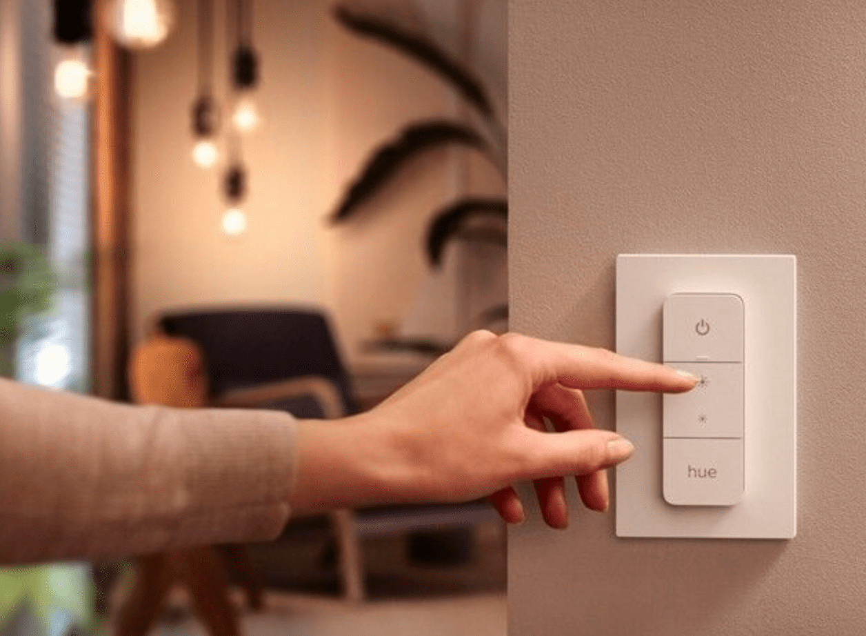 Daljinski upravljalnikPhilips Hue Dimmer Switch za enostavno brezžično vklapljanje/izklapljanje ali nemoteno spreminjanjejakosti svetlobe do 10 svetilk Hue LED ali žarnic Hue LED, ne da bi jih bilo treba povezati z mostom Hue Bridge z dometom do 12 mv zaprtih prostorih z uporabo svetlobne povezaveZigBee ( IEEE 802.15.4). Priložen jestenski nosilec in vključuje gumbno baterijo CR2032 z življenjsko dobo najmanj 2 leti.