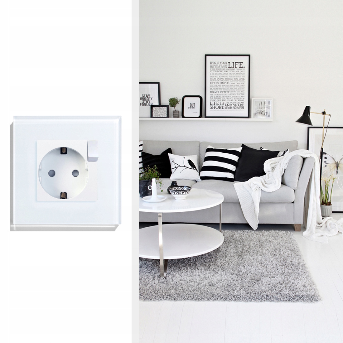 Predstavitev vtičnice, nameščene v steklenem okvirju. (okvir na voljo ločeno)