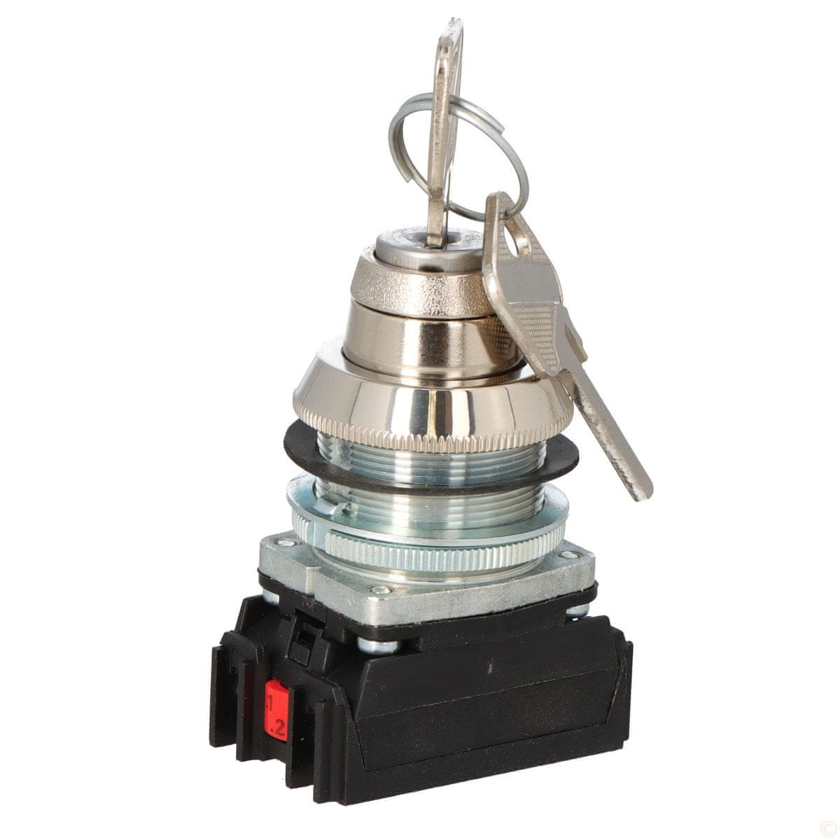 To dvopozicijsko ključno stikalo je profesionalni izdelek poljskega podjetja PROMET. Ima dve preklopni stopnji in okroglo lečo s premerom odprtine 30 mm. Napajalna napetost tega modela je od 110 do 400 V. Izdelek se ponaša z zaščito IP56, kar pomeni, da je gumb popolnoma zaščiten pred vdorom prahu in močnimi vodnimi curki iz katere koli smeri. Sprednji okvir je izdelan iz kovine, zaradi česar je izdelek trpežen, odporen proti poškodbam in dolgotrajen. Srebrno stikalo ima en normalno odprt in en normalno zaprt kontakt.
