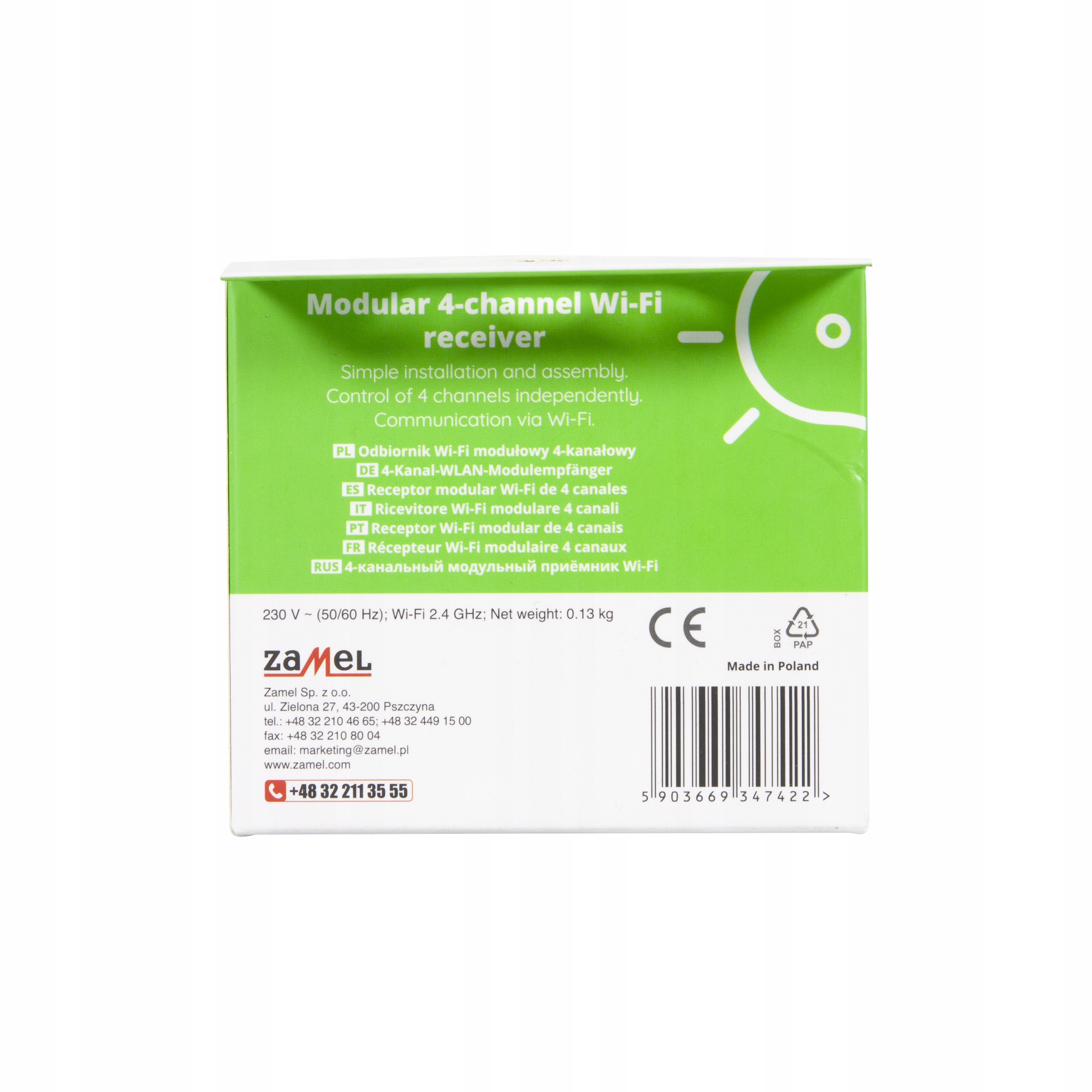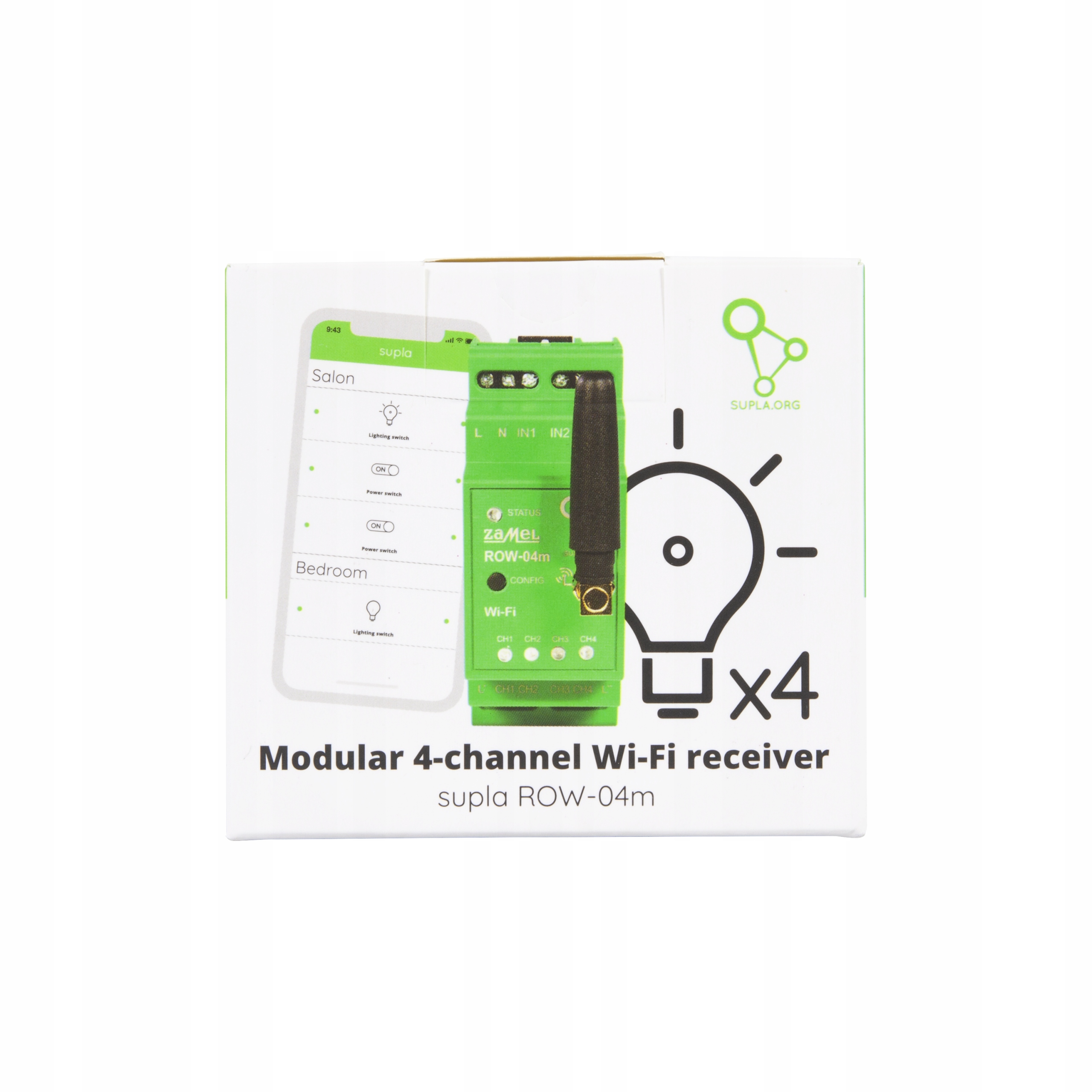 Modularni Wi-Fi sprejemnik ROW-04M je sestavni del Wi-Fi nadzornega sistema Supla, ki omogoča neodvisen nadzor poljubnih štirih naprav (4 kanali – 4 230 V AC tokokrogi). Naprava je nameščena v razdelilni plošči, zaradi česar je zelo vsestranska. Idealen je za nadzor svetilk, opremljenih z žarnicami z žarilno nitko, halogenskimi, LED in CFL žarnicami.
