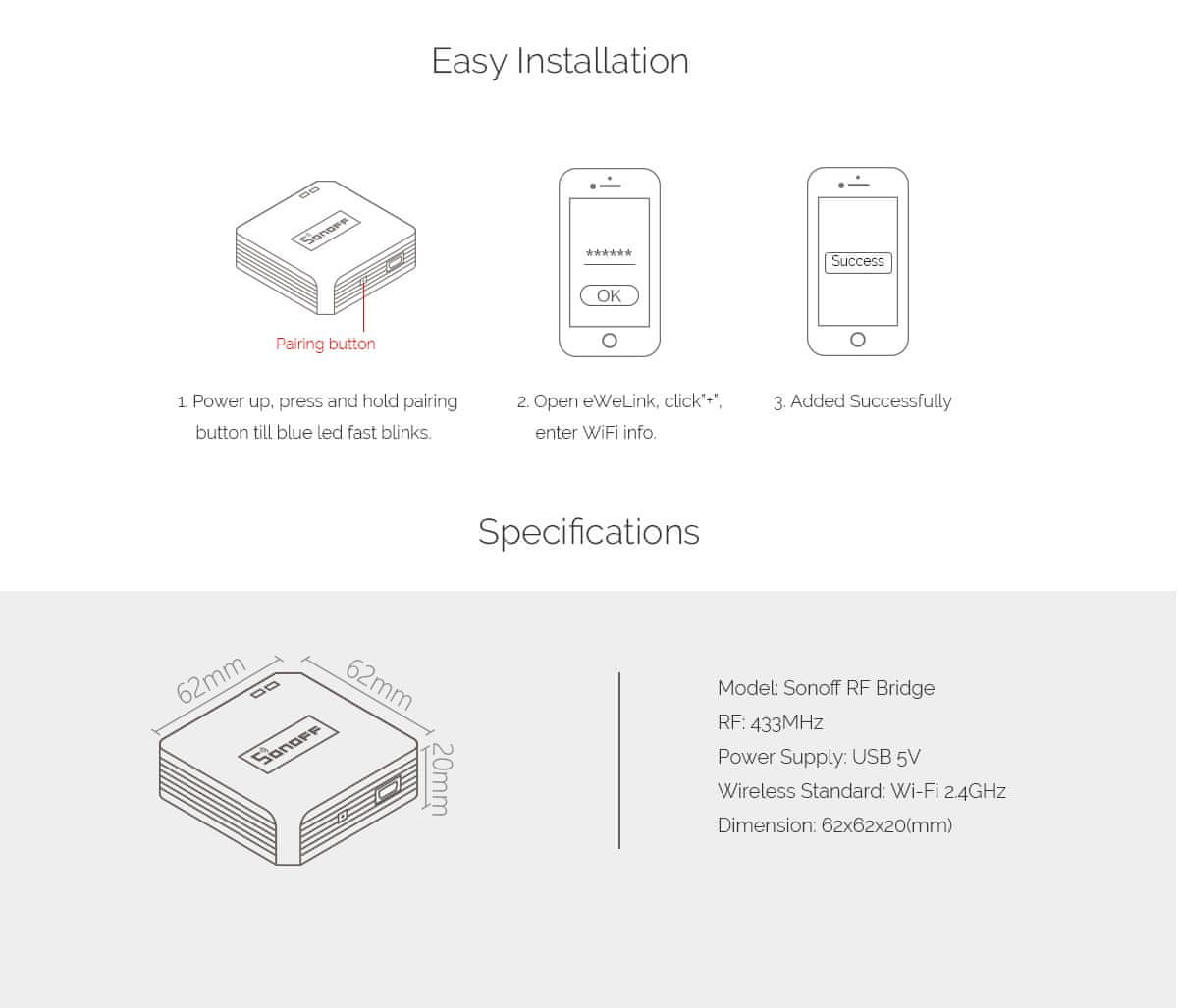 RF Bridge podpira dodajanje do 64 naprav RF 433MHz, ki jih je izdal SONOFF, kot sta PIR3-RF senzor gibanja in DW2-RF brezžični senzor za vrata/okna, s čimer naredite vaš dom pametnejši. Odlično deluje z Amazon Alexa, Google Assistant, IFTTT