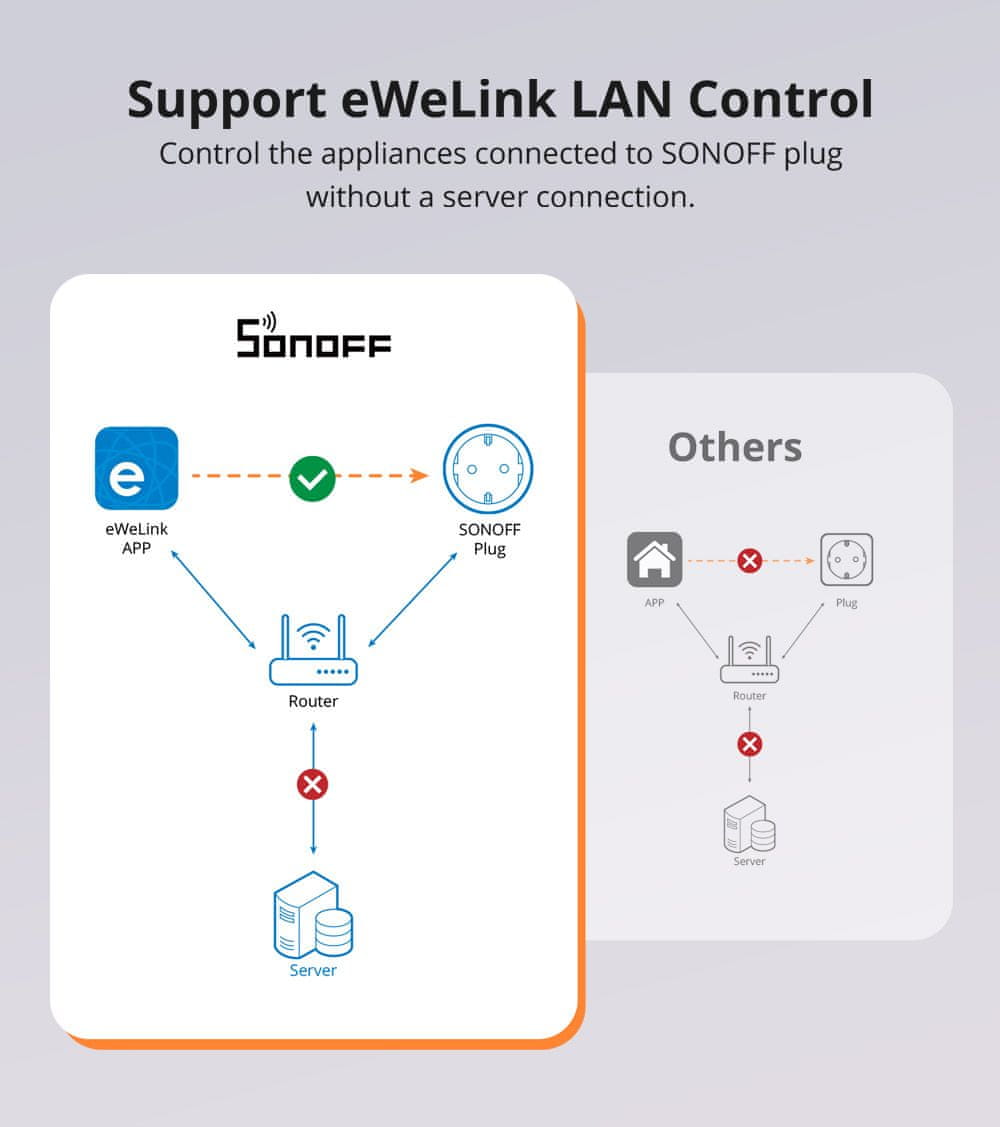 Kot rešitev Plug & Play enostavno pretvori tradicionalno stensko vtičnico v pametno vtičnico in jo lahko upravljate na daljavo prek aplikacije eWeLink (iz pametnega telefona iOS ali Android). Nastavite lahko enkratne in ponavljajoče se načrtovane vklope / izklope, dodate časovnik in nadzor zanke, nastavite stanje vklopa (ON / OFF / LAST STATE) in tudi samodejni vklop in samodejni izklop (inching).
