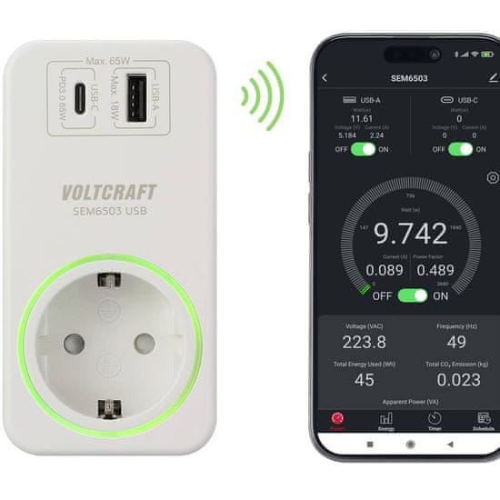 VOLTCRAFT SEM6503 je sodoben merilnik porabe energije, ki poleg klasičnega merjenja omogoča tudi nadzor USB polnjenja in pametno upravljanje naprav preko mobilne aplikacije.