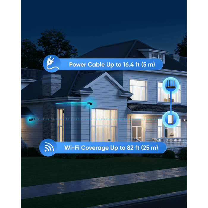 Stabilen Wi-Fi in enostavna samoinstalacija: Stabilna Wi-Fi pokritost, ki doseže vsak kotiček vašega doma (do 464 m²), izogibanje varnostnim slepim točkam zaradi izpadov Wi-Fi ali nezadostne pokritosti. Brezžična povezljivost deluje na razdaljah do 25 metrov med kamerami in HomeBase 3, kar omogoča enostavno samoinstalacijo kjerkoli je na voljo napajanje.