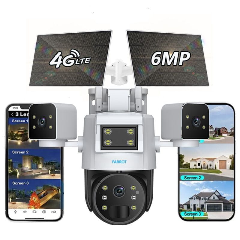 BergMont Vrtljiva kamera IP nadzorna s 3 objektivi, 6 Mpx, Wifi GSM sim kartica 4G, IR nočni vid, 2x sončna celica 14W