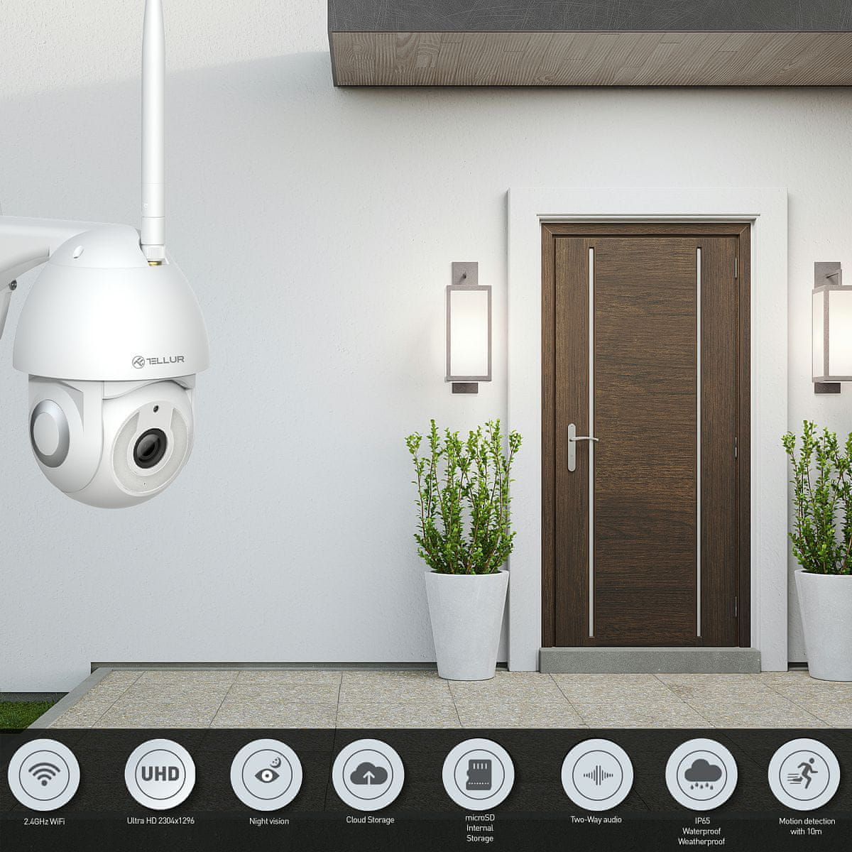Vsako večje posestvo potrebuje zunanjega skrbnika. Zahvaljujoč ločljivosti Ultra HD s senzorjem s 3 milijoni slikovnih pik bodo slike, posnete s to kamero, veliko jasnejše in podrobnejše. Funkciji Pan & Tilt lahko nadzorujete na daljavo in vidite vse, kar se dogaja pred ali na dvorišču vaše hiše, od vsepovsod, tako da preprosto dostopate do aplikacije Tellur Smart s svojega pametnega telefona. Kamera UltraHD je popolnoma odporna na vremenske vplive (ocena IP65) in popolnoma sposobna vzdržati dež, sneg, vlago, prah in umazanijo. Nič ne more ostati neopaženo s to nadzorno napravo, saj je opremljena s funkcijo samodejnega sledenja, zaznanemu subjektu pa bo sledil zahvaljujoč svojemu senzorju gibanja. Poleg tega boste prejeli potisna obvestila vsakič, ko bo zaznano gibanje. Za dodatno raven varnosti kamera snema vsako gibanje v ločljivosti Ultra HD in samodejno preide v način nočnega vida, ko senzor zazna zmanjšanje jakosti svetlobe. Poleg tega, ko je aktiviran način zasebnosti, bo kamera izklopila funkcije snemanja in zaznavanja. Poleg tega je ta kamera združljiva in jo je mogoče upravljati z glasom s pomočjo Alexa in Google Assistant.