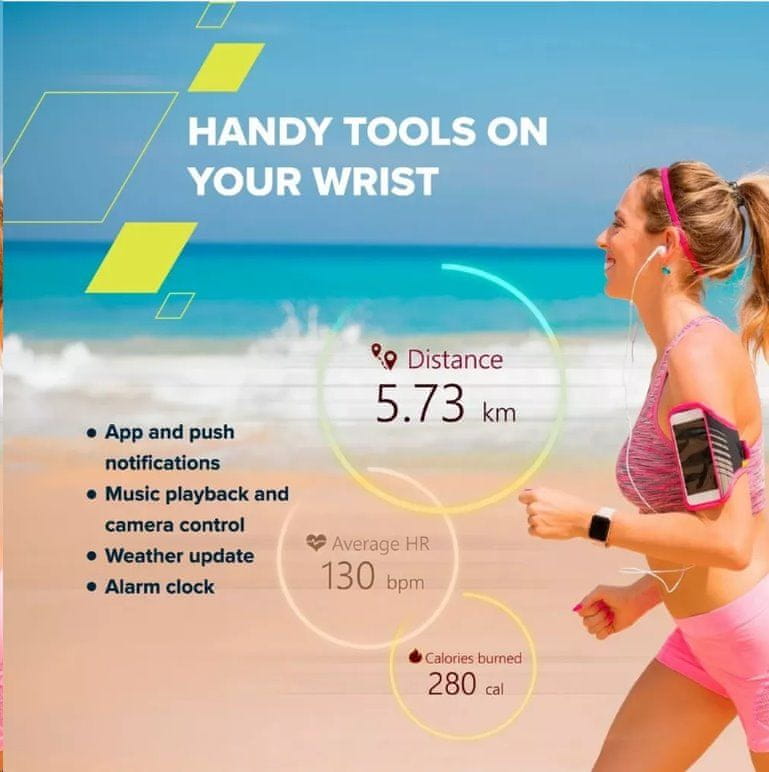 Združljiva z operacijskim sistemom Android 7.0 in novejšim (pametni telefoni z BT 4.0+ in podporo Google Play, Android GO brez podpore za obvestila), iOS 13.0 in novejšim 1,7'' zaslon IPS Fulltouch Elegantna tanka zasnova Majhna teža Spremljanje srčnega utripa Priljubljeni športni načini, izračun kalorij in razdalje Vremenska napoved Silikonski trak Resnična zaščita IP68 Sledenje spanju Daljinsko upravljanje kamere in glasbe Opozorila na klice in aplikacija APP Opozorilo o sedenju in opozorilo o pitju vode Velika zmogljivost baterije in čas delovanja do 5 dni Štoparica Budilka Iskalnik telefona Športni načini: hoja, tek, tekalna steza, pohodništvo, kolesarjenje, plavanje, nogomet, košarka, odbojka, badminton, namizni tenis, baseball, skakanje, joga