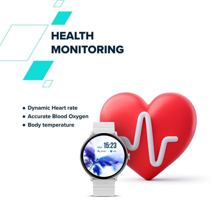 Odkrijte popolno kombinacijo sloga in funkcionalnosti s pametno uro Canyon Life. Ta elegantna in vsestranska ura bo s svojimi pametnimi funkcijami izboljšala vaš vsakdan in vas ohranila povezane s svetom! Pametna ura Jacky SW-69 bo spremljala vašo telesno temperaturo, srčni utrip in raven kisika v krvi. Izbirate lahko med 25 športnimi načini, da dosežete svoje fitnes cilje, in spremljate svoj napredek s štetjem korakov, razdaljo in izračunavanjem kalorij. Izboljšajte svoje splošno počutje z obvladovanjem stresa in spremljanjem spanja. Prav tako lahko preprosto sprejemate klice, sporočila in posodobitve družabnih omrežij neposredno na zapestju. Prilagodite svojo uro z različnimi številčnicami in virtualnimi vizitkami, da izrazite svoj edinstven slog. Poleg tega je ura vodoodporna z zaščito IP68 in ima baterijo z dolgo življenjsko dobo. Na 1,3-palčnem zaslonu LTPS lahko uživate v jasni sliki. Do pomembnih orodij, kot so štoparica, kalkulator in alarm,