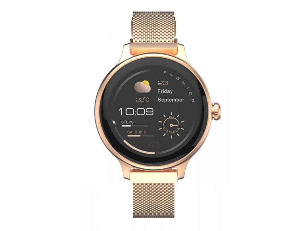 Vsi vaši podatki o dejavnosti Sodobna pametna ura za fitnes Carneo HERO mini HR+ v elegantni zlati in roza barvi ima okrogel barvni zaslon Super HD AMOLED. Omogoča merjenje srčnega utripa, stresa, indeksa telesne mase, prehojene razdalje, spremljanje porabljenih kalorij ali kakovosti spanja. Vključujejo 230 mAh baterijo z življenjsko dobo od 3 do 4 dni. Certifikat IP67 pomeni, da so odporne na vodo in prah. Združljive so z operacijskima sistemoma iOS in Android. Uri imata razkošen milanski, kovinski trak v zlatorumeni barvi, ki ga lahko zamenjate za silikonski trak v drugi barvi ali usnjeni trak, da spremenite menedžerski videz ure v športnega. Okusno, preprosto in razkošno zasnovo je enostavno kombinirati z obleko ali oblačili za prosti čas. Ura in aplikacija sta v celoti v angleškem jeziku, zato se boste zagotovo dobro razumeli. Priložen je tudi silikonski, roza pas, ki je prav tako priložen k uri.