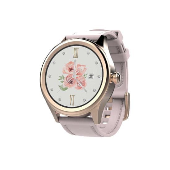 Resnično pametna ura Pametna ura Carneo Prime GTR v elegantni zlati barvi, barvni zaslon na dotik je mogoče aktivirati s preprostim zasukom roke. Poleg običajnih „pametnih“ funkcij ima tudi športne funkcije za fitnes, vse v elegantnem poslovnem videzu. Silikonski trak v rožnato zlati barvi z usnjenim pasom s šivi še poveča njihovo eleganco.