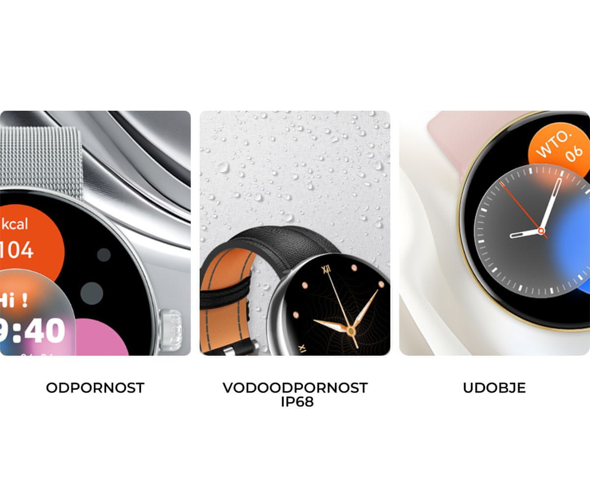 - Uporabniku prijazna pametna ura – enostavno in intuitivno upravljanje z zaslonom na dotik in stranskim gumbom.