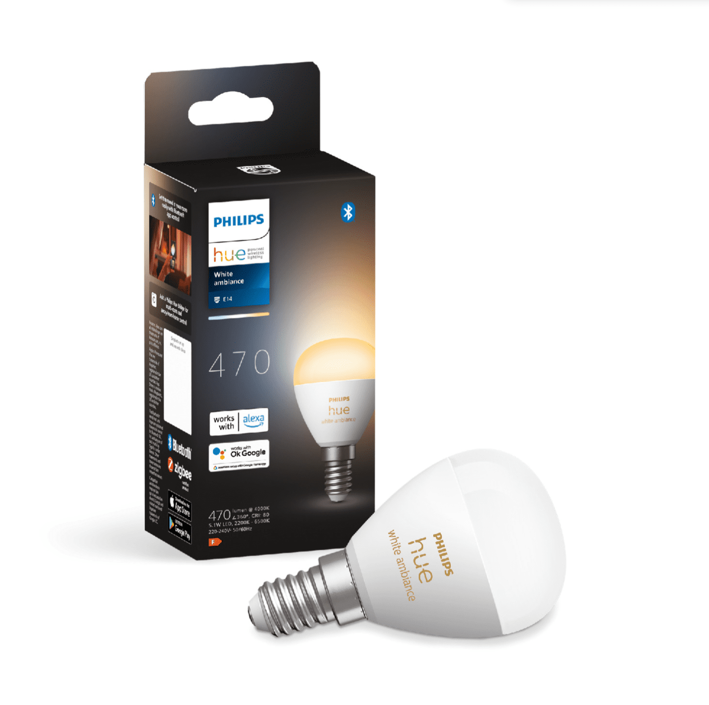 Pametna žarnica LED Philips Hue White Ambiance v tradicionalni zasnovi z matirano belo žarnico v obliki pokrovčkaP45 oddaja močno svetlobo s temperaturo kromatičnosti od2200K do 6500K, ki jo lahko zatemniti in prilagoditi v beli barvi z daljinskim upravljalnikomPhilips Dimmer Switch ( ni priložen) ali mobilno aplikacijoPhilips Hue, ki jo lahko preprosto prenesete z Google Play ali Apple Store.