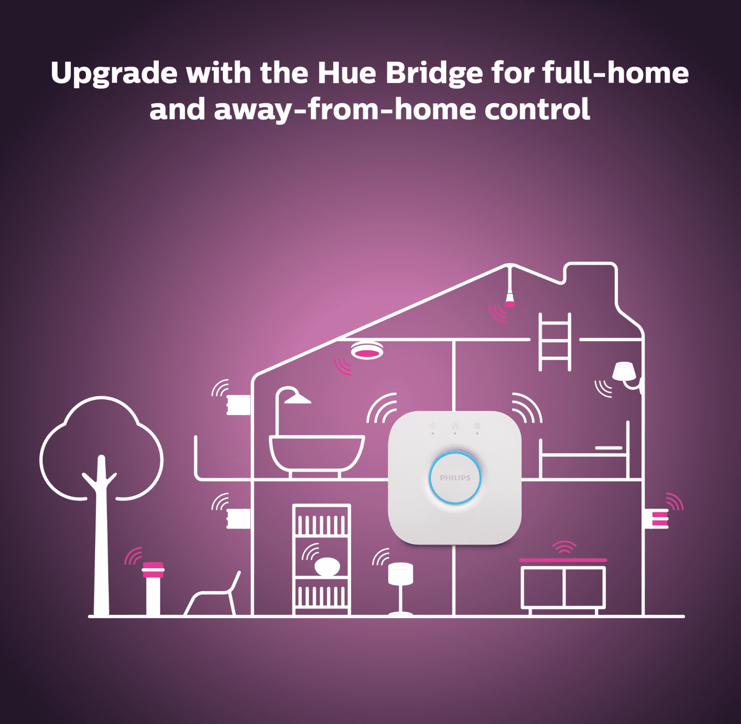Preprosto ga lahkopovežete prek povezave Bluetooth ali prek mostuPhilips Hue Bridge ( ni priložen), kar vam omogoča dodatne možnosti, kot jeglasovno upravljanje alinastavljanje urnikov dnevne in nočne osvetlitve. V aplikacijoHue Bluetooth lahko hkrati dodate do 10 luči.