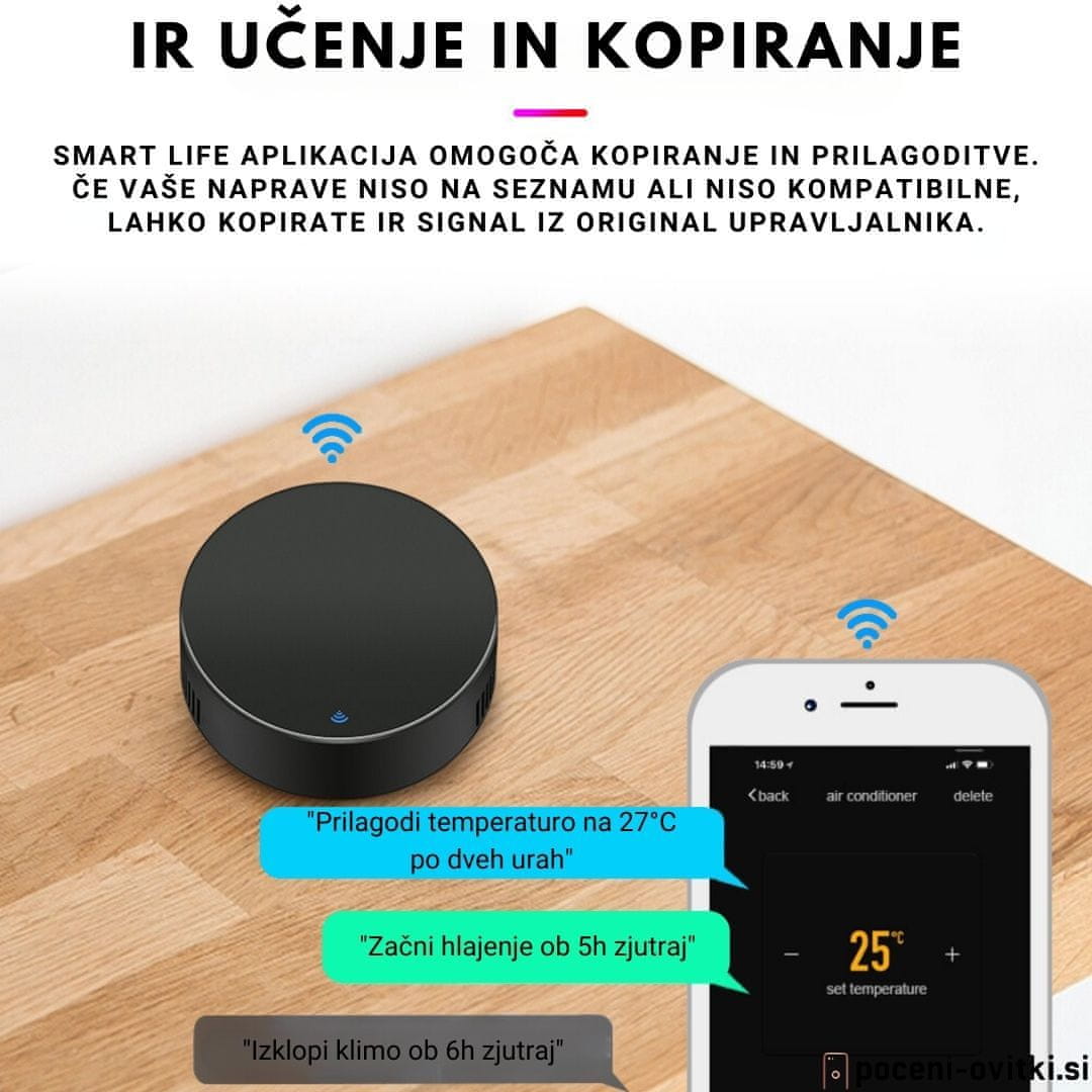S tem univerzalnim infrardečim daljinskim upravljalnikom lahko uporabljate pametni telefon za upravljanje gospodinjskih aparatov, kot so STB (televizijski sprejemnik), TV Box, televizor, klimatsko napravo, ventilator, DVD predvajalnik itd. Združljivo z večino znamk, za podrobnosti glejte seznam podprtih znamk v aplikaciji. Poleg tega ima funkcijo učenja, ki vam omogoča kopiranje IR ključa originalnega daljinskega upravljalnika v aplikacijo.