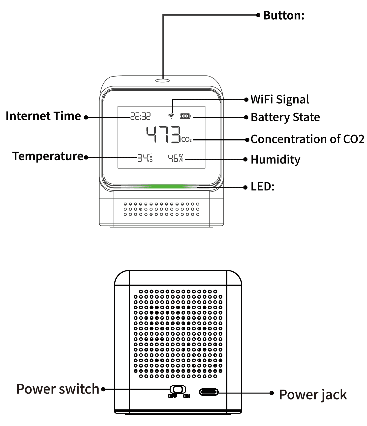 Pametni detektor ogljikovega dioksida ima štiri stopnje koncentracije ogljikovega dioksida:- Zelena: 400–1000 ppm