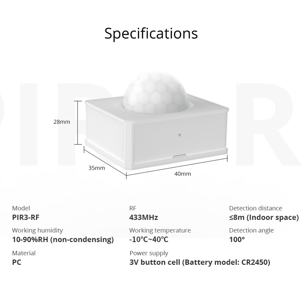 Razlika med senzorjem gibanja SONOFF PIR2 RF je v tem, da je PIR3-RF majhen in kompakten, katerega je enostavno uporabiti v skoraj vsakem položaju za zaznavanje gibanja. Senzor gibanja PIR3 zazna in poroča o gibanju, ko se uporablja za vaš domači varnostni sistem, lahko zazna gibanje znotraj 8M in pomaga prepoznati, ali se človek ali hišni ljubljenček premika po vaši hiši, vaš mobilni telefon pa bo prejel opozorilno obvestilo. Povežite kamero SONOFF in lahko vidite, kdo je vsiljivec. Senzor je lahko preko SONOFF RF Bridge povezan v vaš pametni dom in lahko nastavite, da se luč vklopi ko vstopite skozi vrata. PIR3 RF ima 2 načina delovanja, opozorilni in normalen način. V načinu opozorila se senzor sproži na 5 s, ko nekdo vstopi v območje zaznavanja. V običajnem načinu se aktivira naslednji sprožilec opozorila, če v 1 minuti po prejšnjem zaznavanju ni nobenega gibanja.