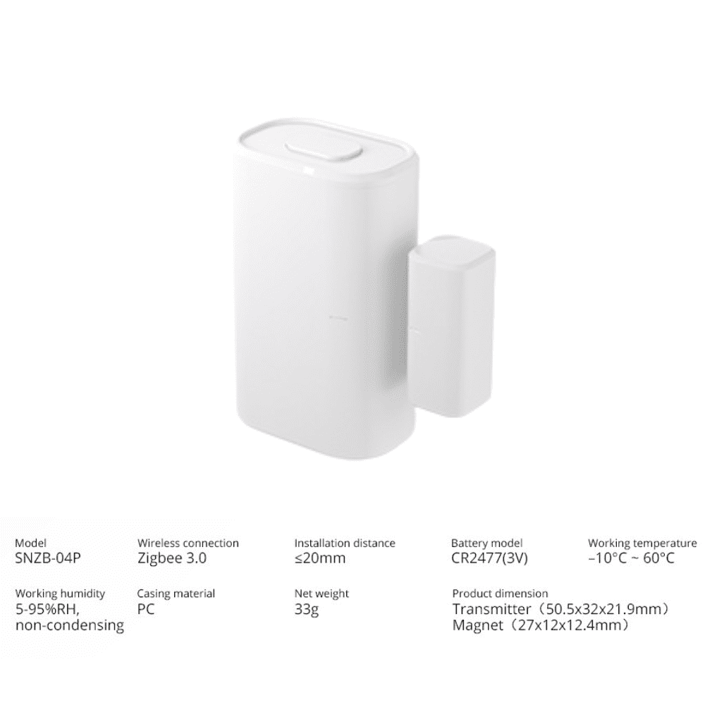 V primerjavi s SNZB-04 ima SNZB-04P izboljšan dizajn in zmogljivost. Z opozorilom o nedovoljenih posegih, 5-letno življenjsko dobo baterije, največja razdalja namestitve je 20 mm in senzor za vklop/izklop za več kot nekaj časa se lahko uporabi kot pogoj za sprožitev scene.