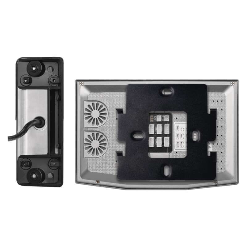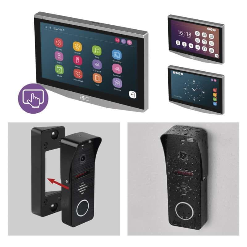 Zunanja enota videodomofona je narejena iz kovine ter izjemno trpežna, z visoko stopnjo zaščite IP65. Zagotavlja odpornost na vse vremenske razmere, izpostavljena pa je lahko tudi nočnem sneženju ali dežju. Eleganten 7-inčni LCD zaslon na dotik s pomočjo tehnologije IPS zagotavlja boljši prikaz barv in širši vidni kot kot običajni LCD zasloni. Ponuja tri prednastavljene grafične načine.